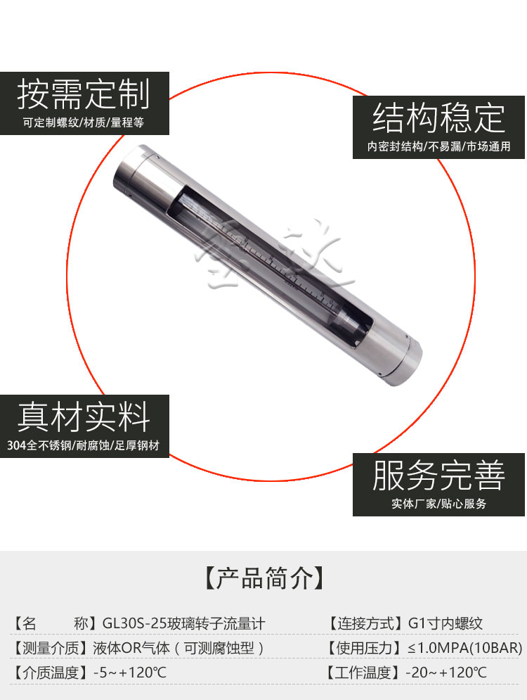 GL30S-25不銹鋼玻璃轉子流量計是一款采用直讀顯示,垂直螺紋連接,測量液體或者氣體的全不銹鋼玻璃轉子流量計。